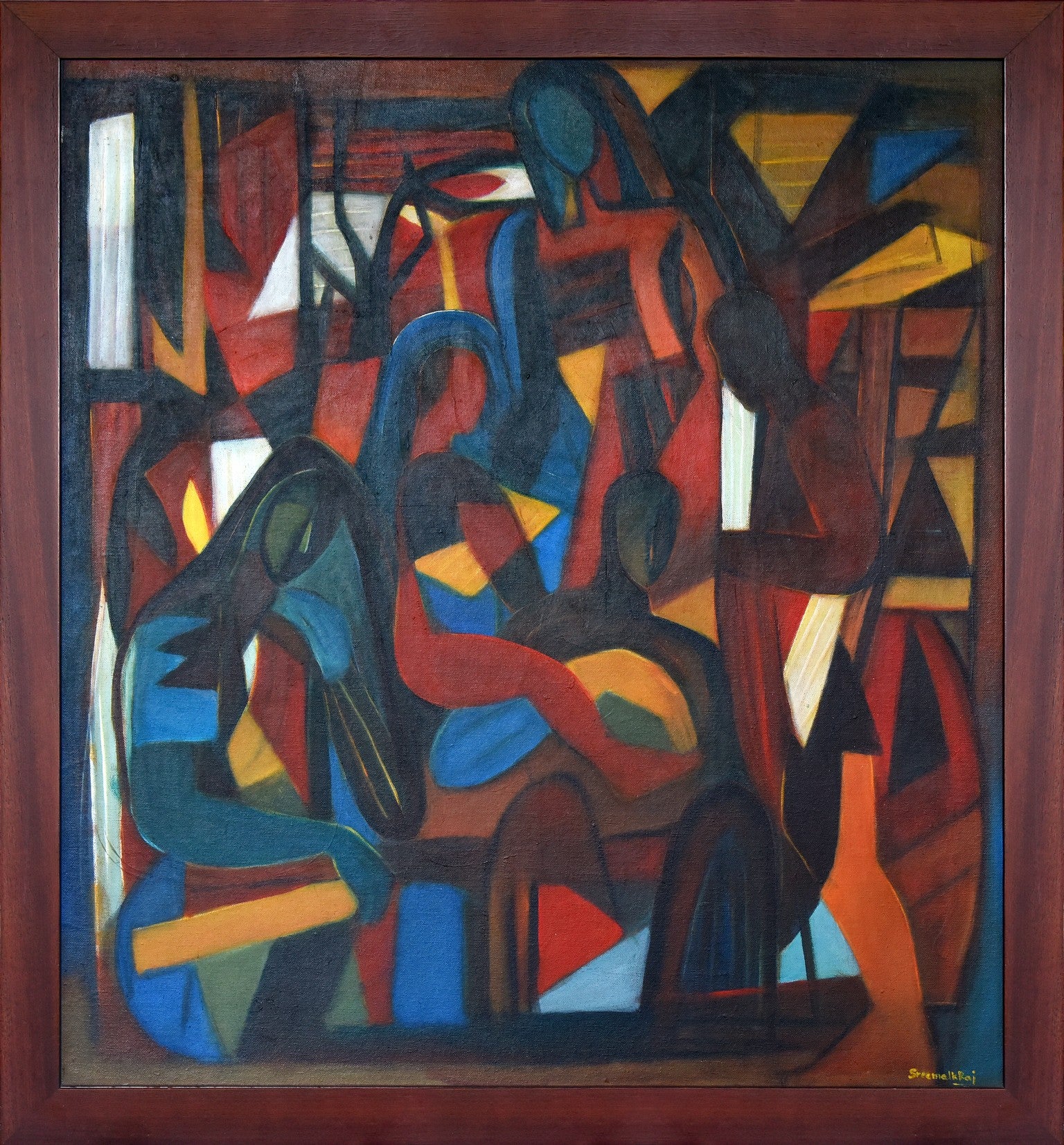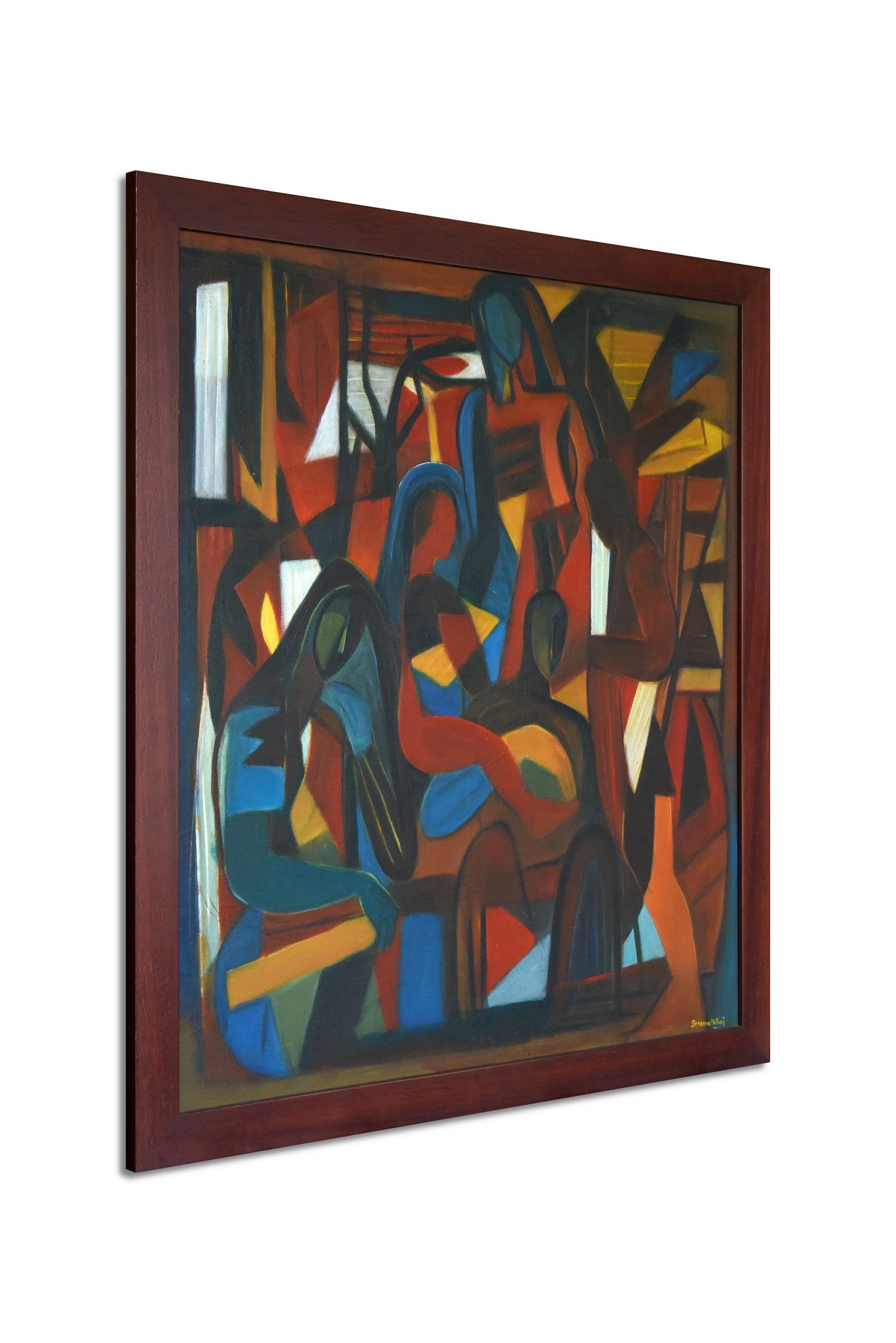 A striking abstract painting depicting human figures through geometric shapes and a muted yet expressive palette. The composition, dominated by warm hues of red and brown, creates a sense of intimacy and introspection, inviting the viewer to explore deeper emotional connections. This modern art piece blends contemporary aesthetics with a thought-provoking narrative, making it a perfect addition to living rooms, offices, galleries, or creative spaces.