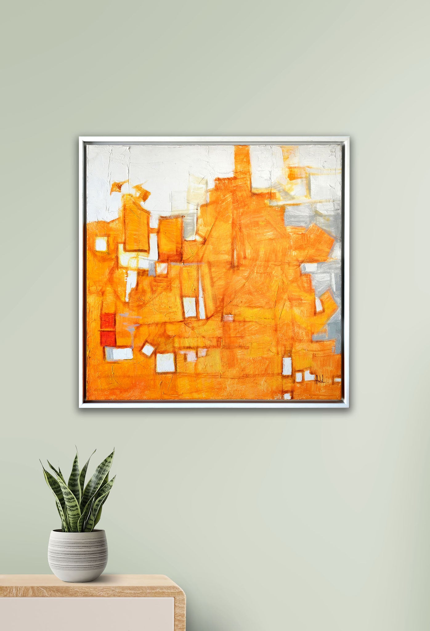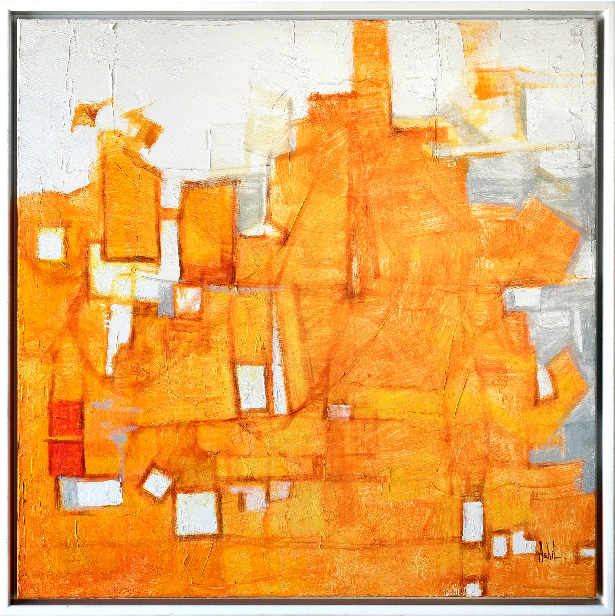 This artwork features a vibrant orange and yellow abstract composition on a light background. Textured, layered strokes form fragmented, geometric shapes, interspersed with white squares. The warm tones and structured forms suggest an urban landscape or abstract expression, creating a modern, visually engaging piece.