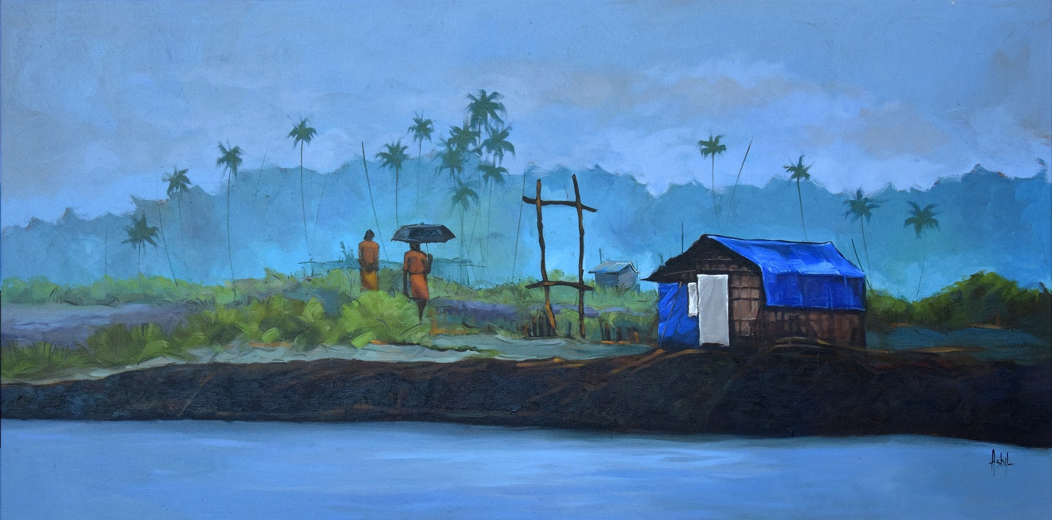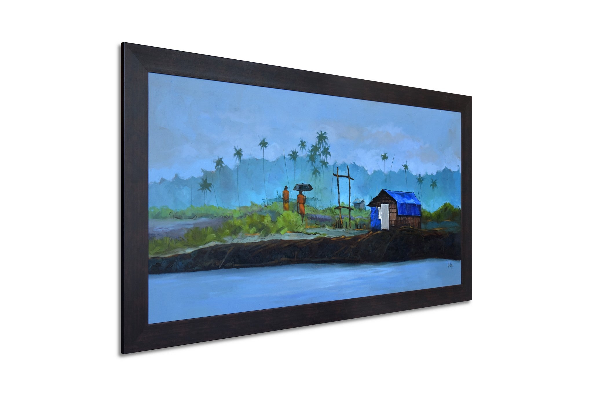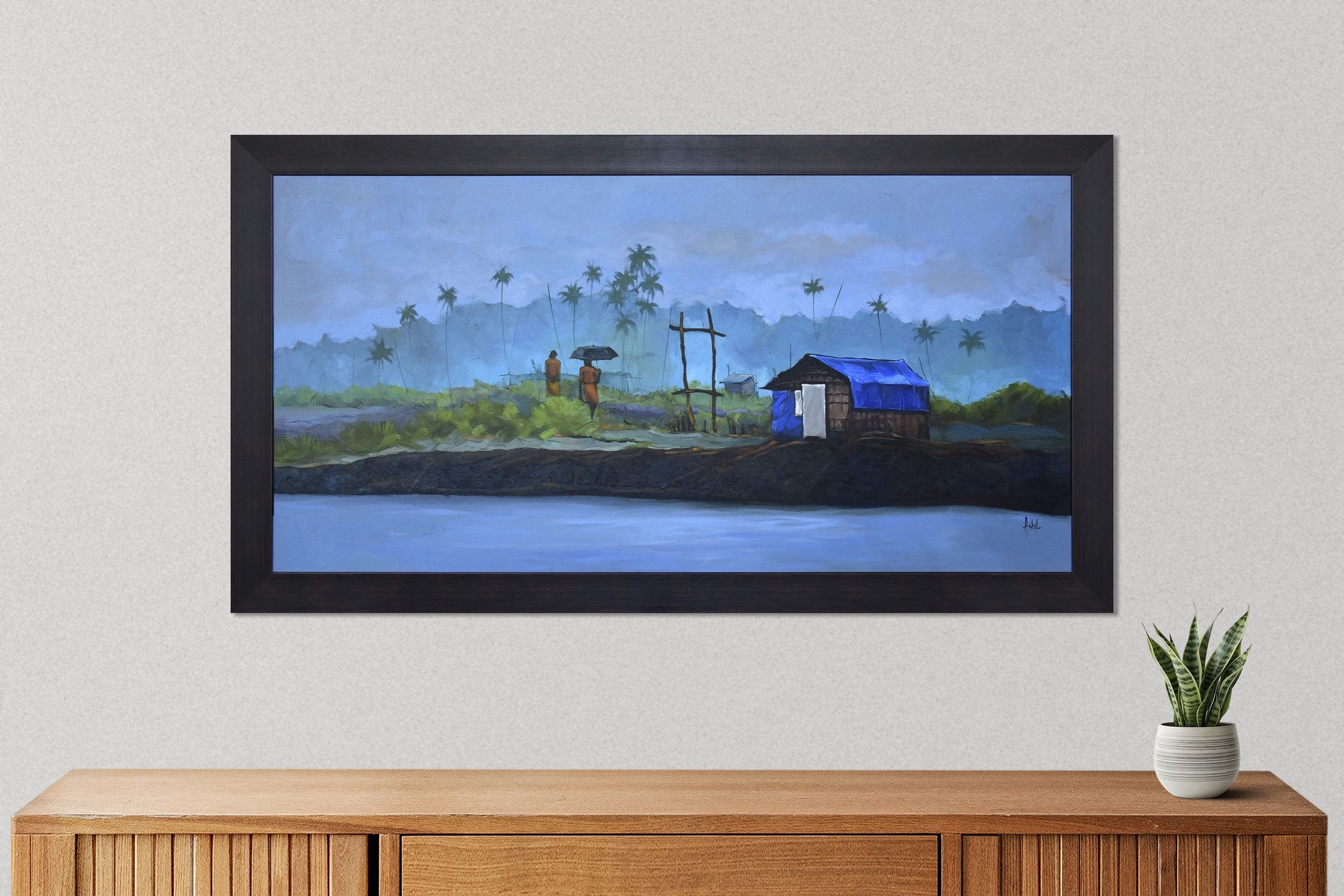 This mesmerizing acrylic on canvas painting captures the enchanting beauty of Kadamakudy, where Kerala’s backwaters come alive with the rhythm of the monsoon. The Backwaters, lush green landscape, and misty horizons blend together in a scene that evokes serenity, nostalgia, and the essence of nature’s renewal. A perfect addition for collectors who appreciate landscape painting, Indian art, and the timeless charm of Kerala’s waterways.