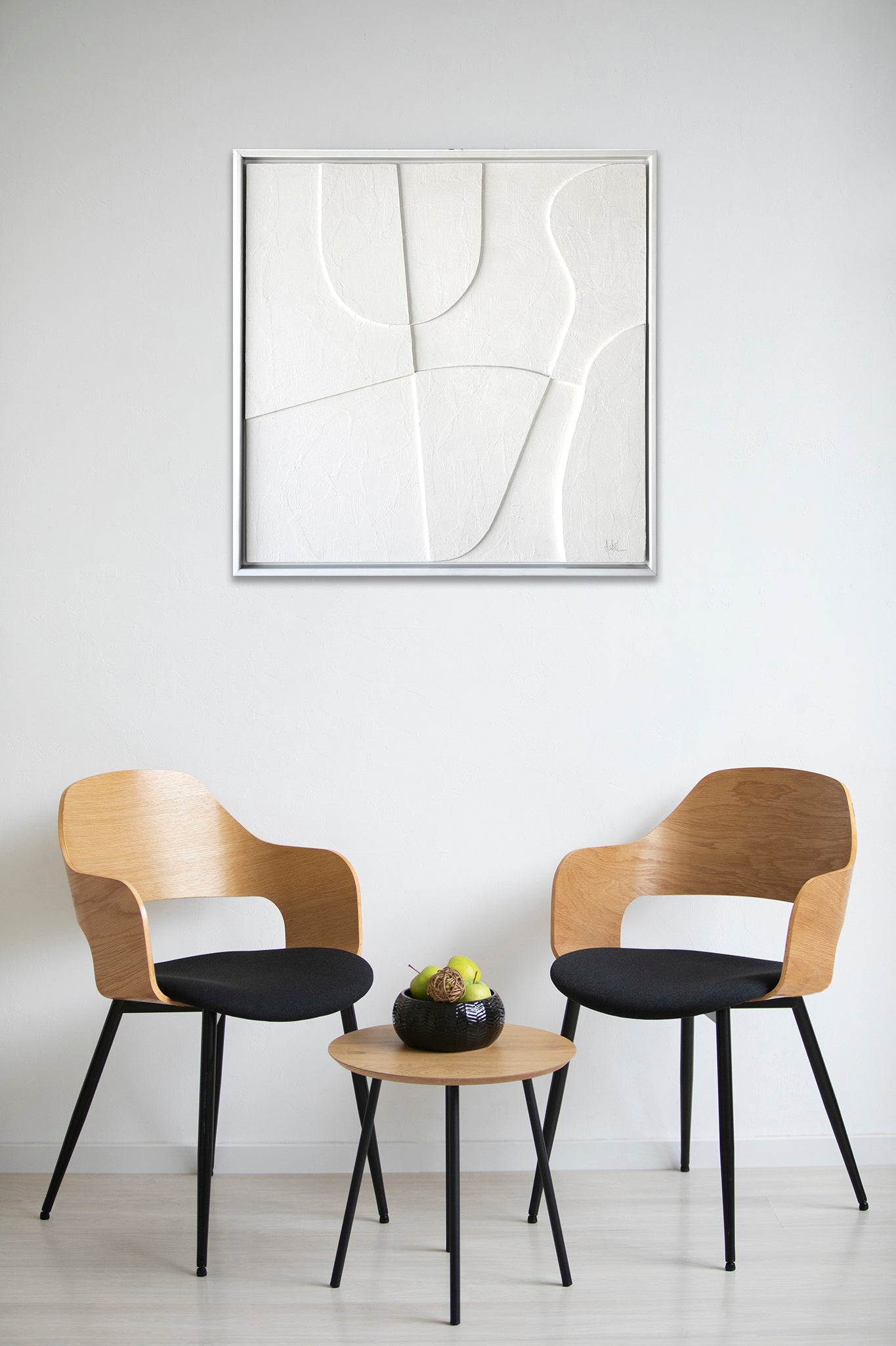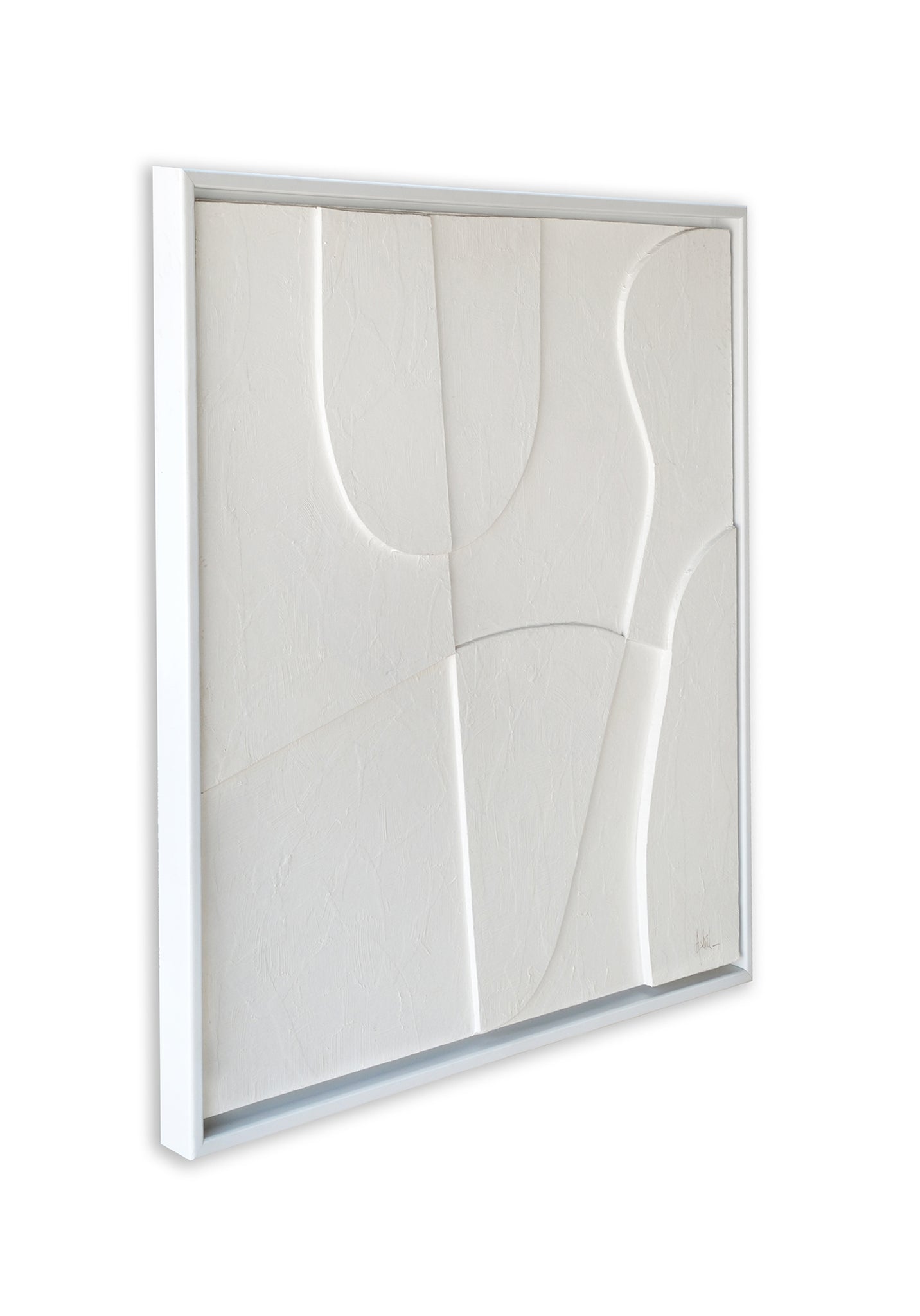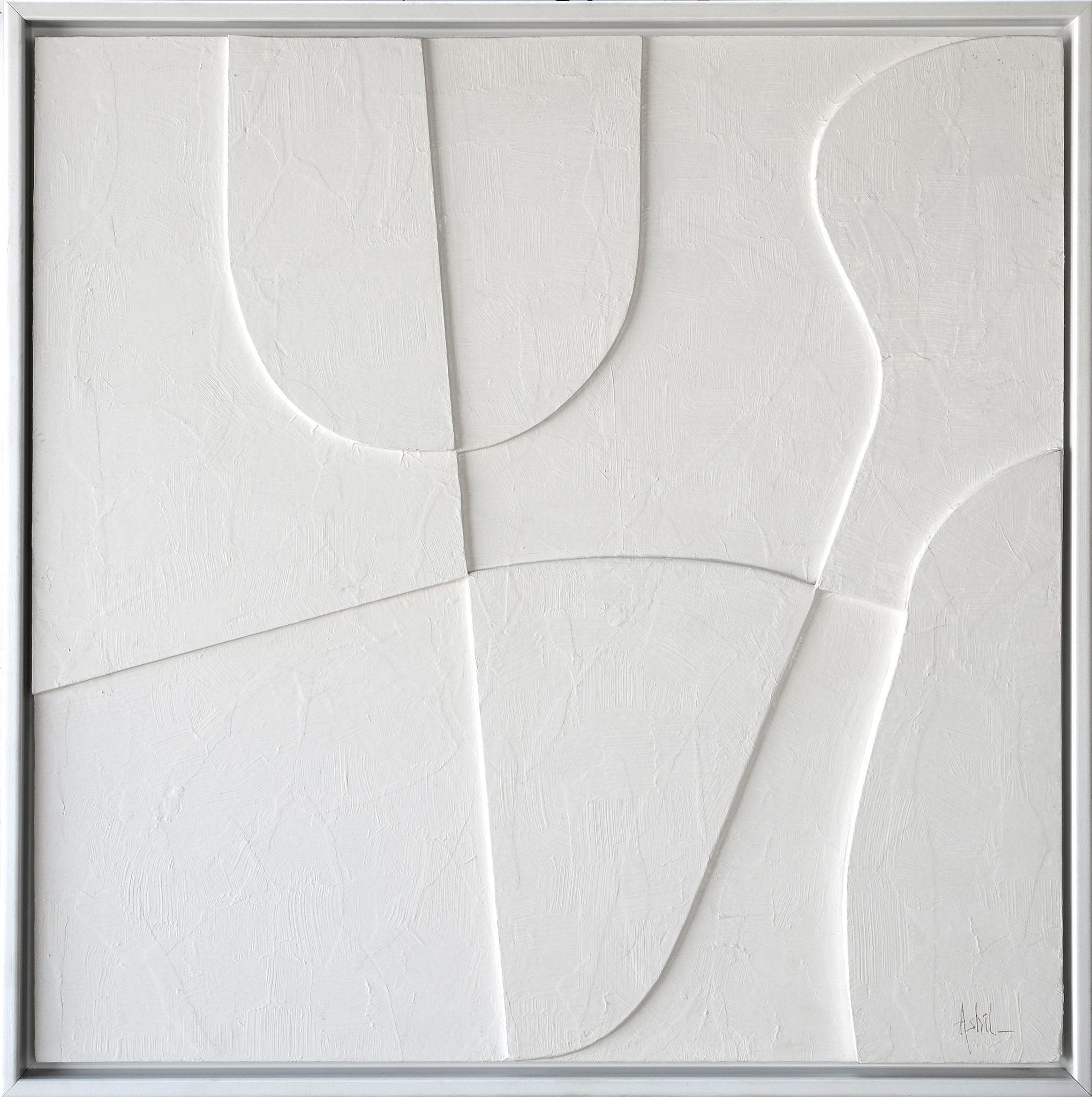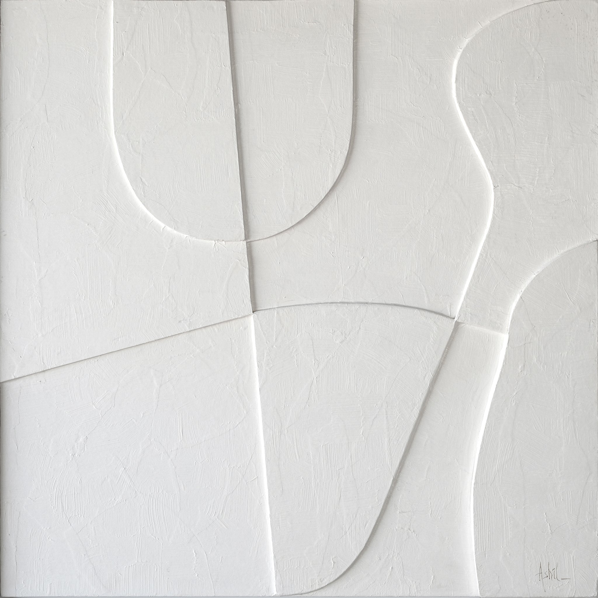 This minimalist, square mixed-media artwork on board presents a textured, off-white surface with subtly raised lines forming abstract, geometric shapes and a clean cut that reveals a layer beneath. The thin, curving and intersecting lines create a sense of quiet movement, and the cut, a bold intervention, adds a dynamic element. Framed simply, the piece highlights the interplay of light and shadow, emphasizing its tactile quality and understated elegance.