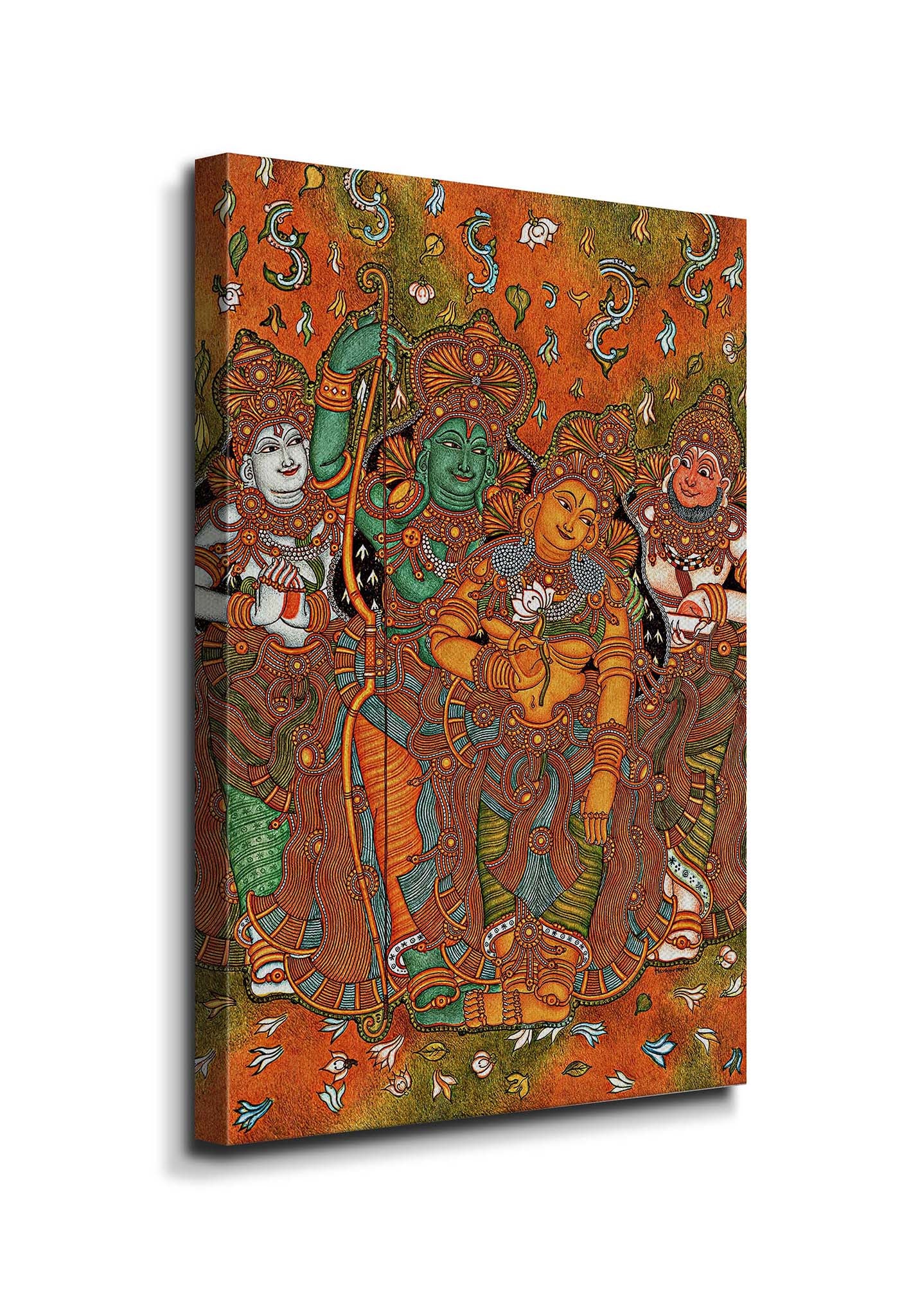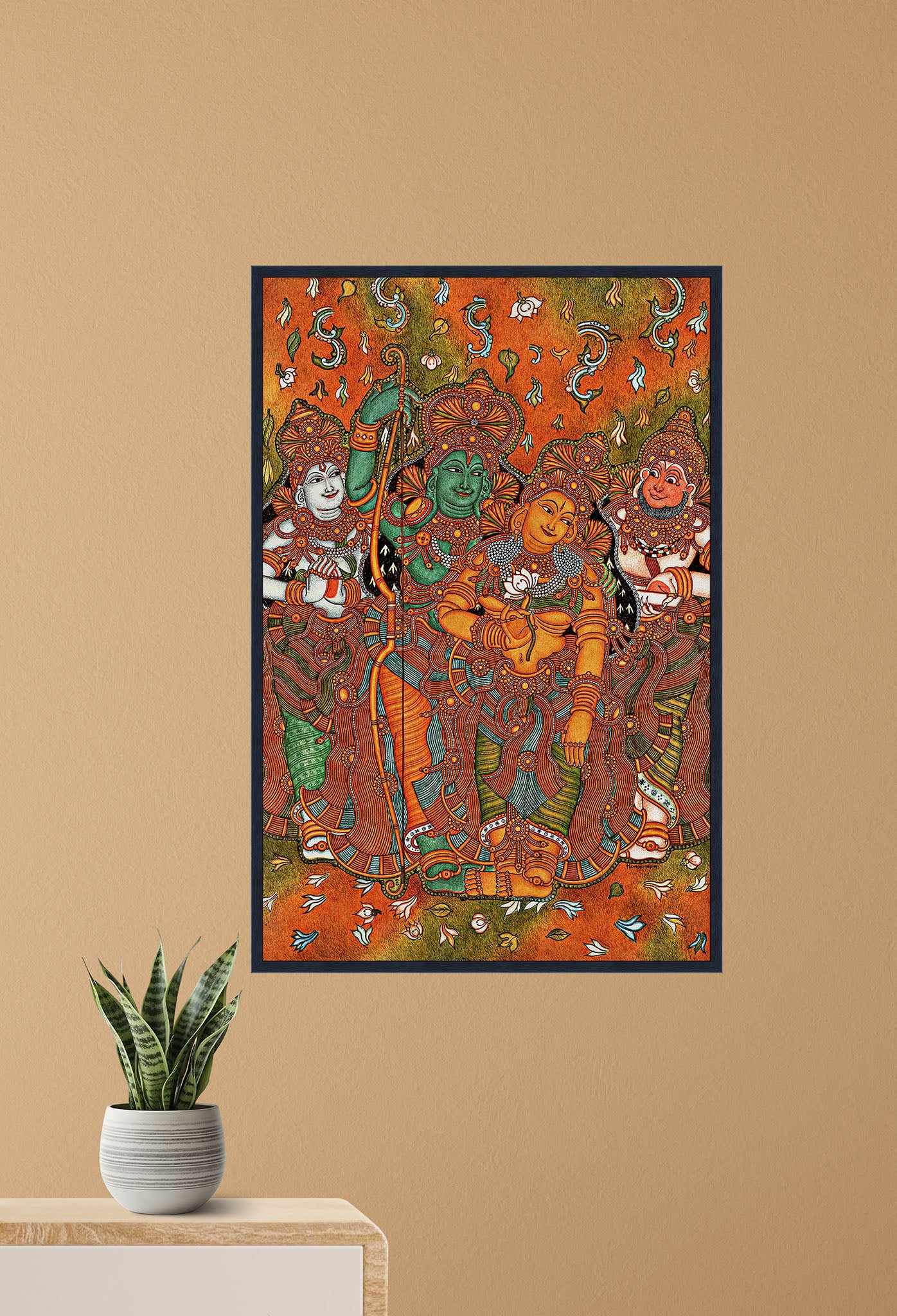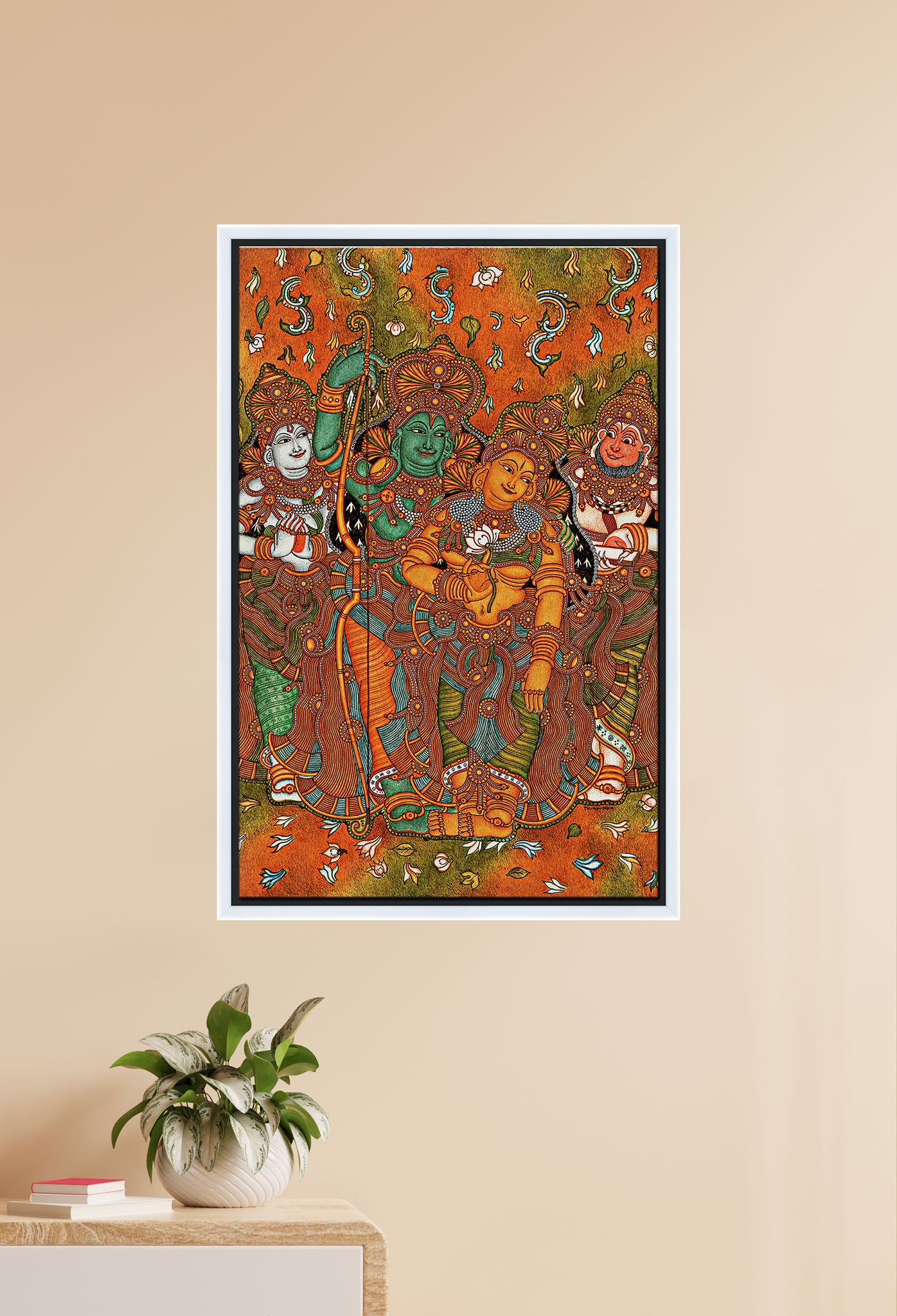 Immerse yourself in the grandeur of Indian mythology with "Sita Raman," a breathtaking artwork celebrating the eternal bond of Lord Rama and Goddess Sita. Intricately designed with vibrant hues of orange, green, and gold, this piece beautifully captures the grace, divinity, and auspiciousness of the revered couple. The traditional Kerala mural-inspired detailing adds a touch of heritage and cultural depth, making it a timeless addition to any sacred or artistic space.