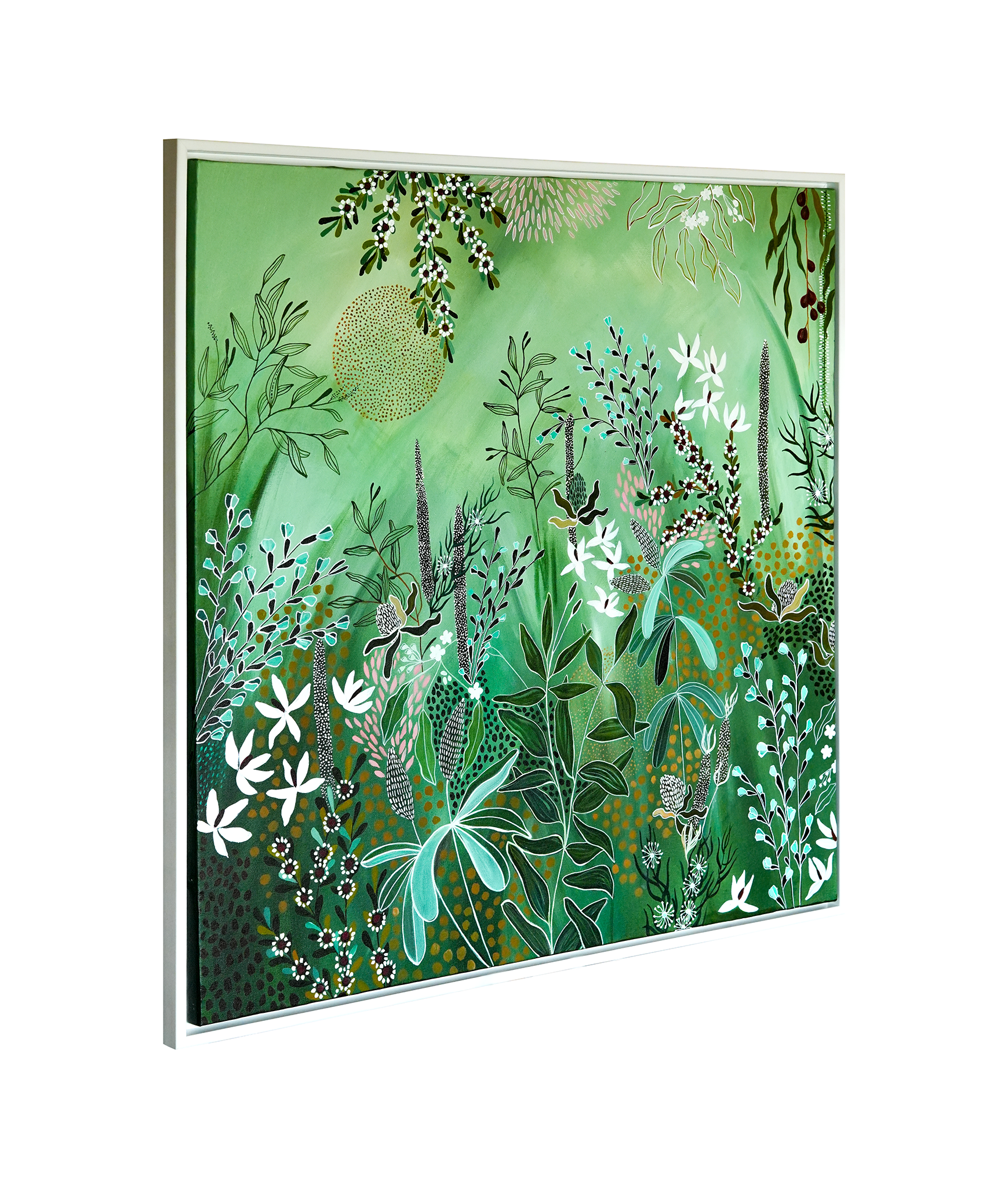 A verdant tapestry of greens, ranging from deep emeralds to luminous jades, creates a sense of depth and mystery. Intricate details of leaves, ferns and exotic blooms are rendered in delicate linework and subtle shading. Touches of white and gold add a luminous quality, hinting at sunlight filtering through the dense canopy.