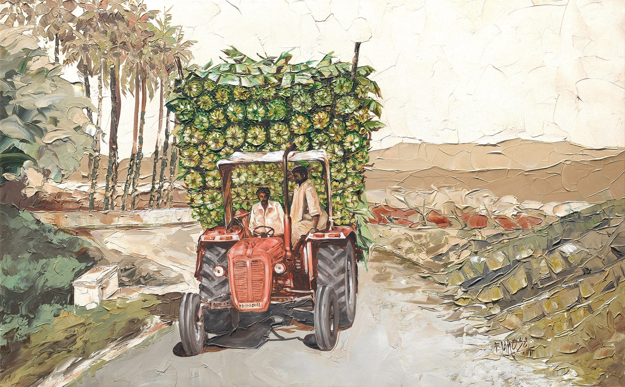 The painting bursts with the vibrant pulse of a rural scene. A red tractor, carrying farmers and a heavily loaded harvest of crops that forms a large, green, textured mass, moves along a light-colored road winding through a landscape dotted with lush green vegetation, including tall palm trees on the left. In the background, rolling hills or slightly elevated terrain are visible under a bright, slightly overcast sky. The style suggests a focus on capturing the essence of agricultural activity and the local environment.