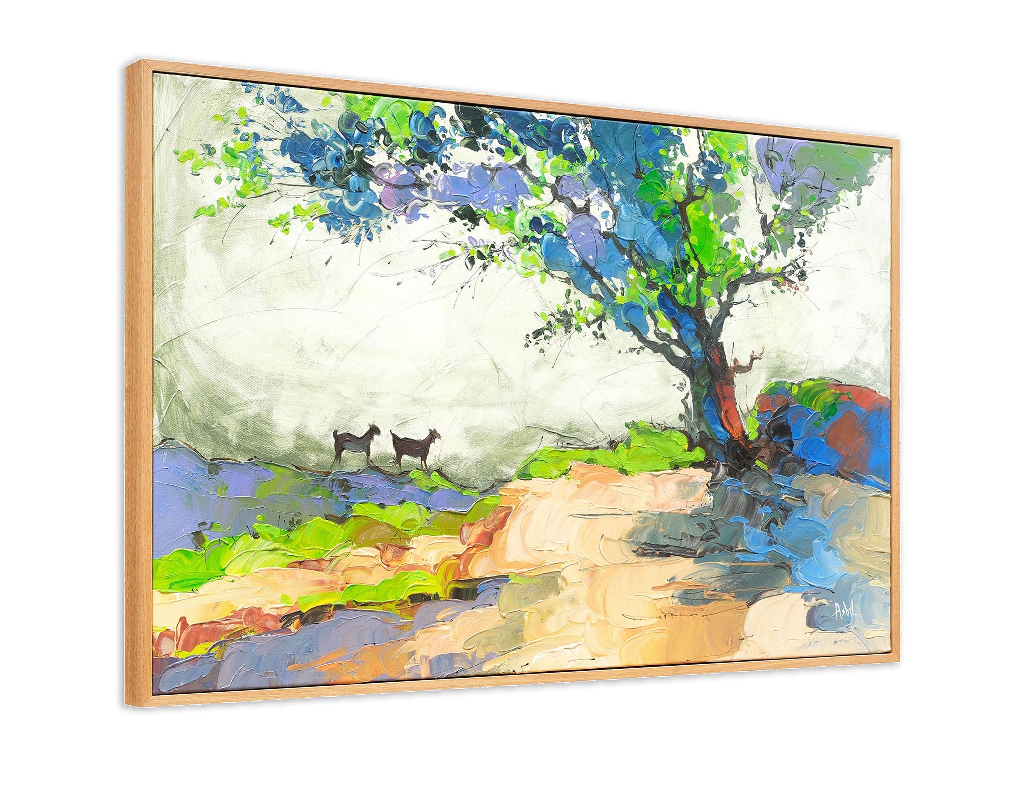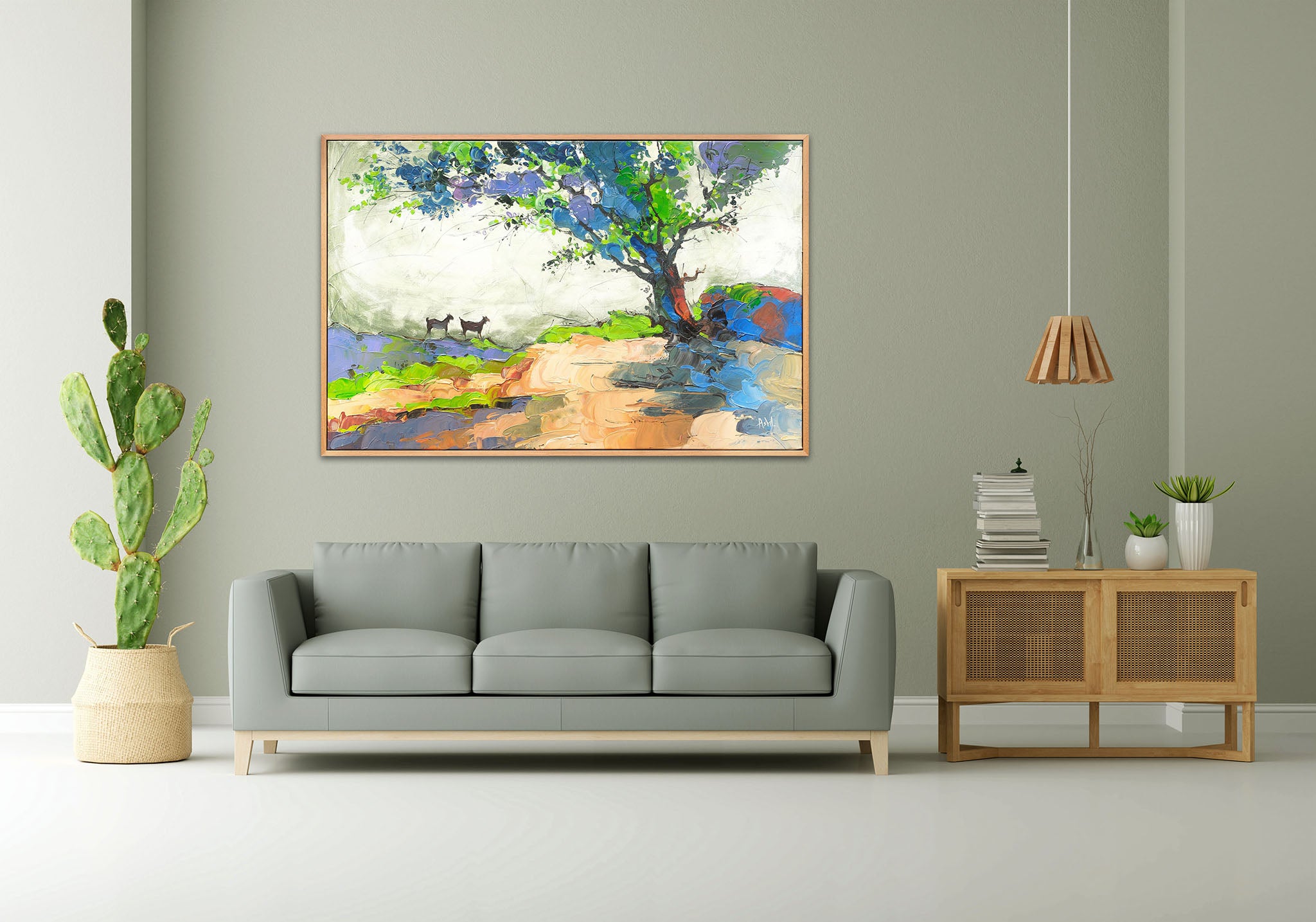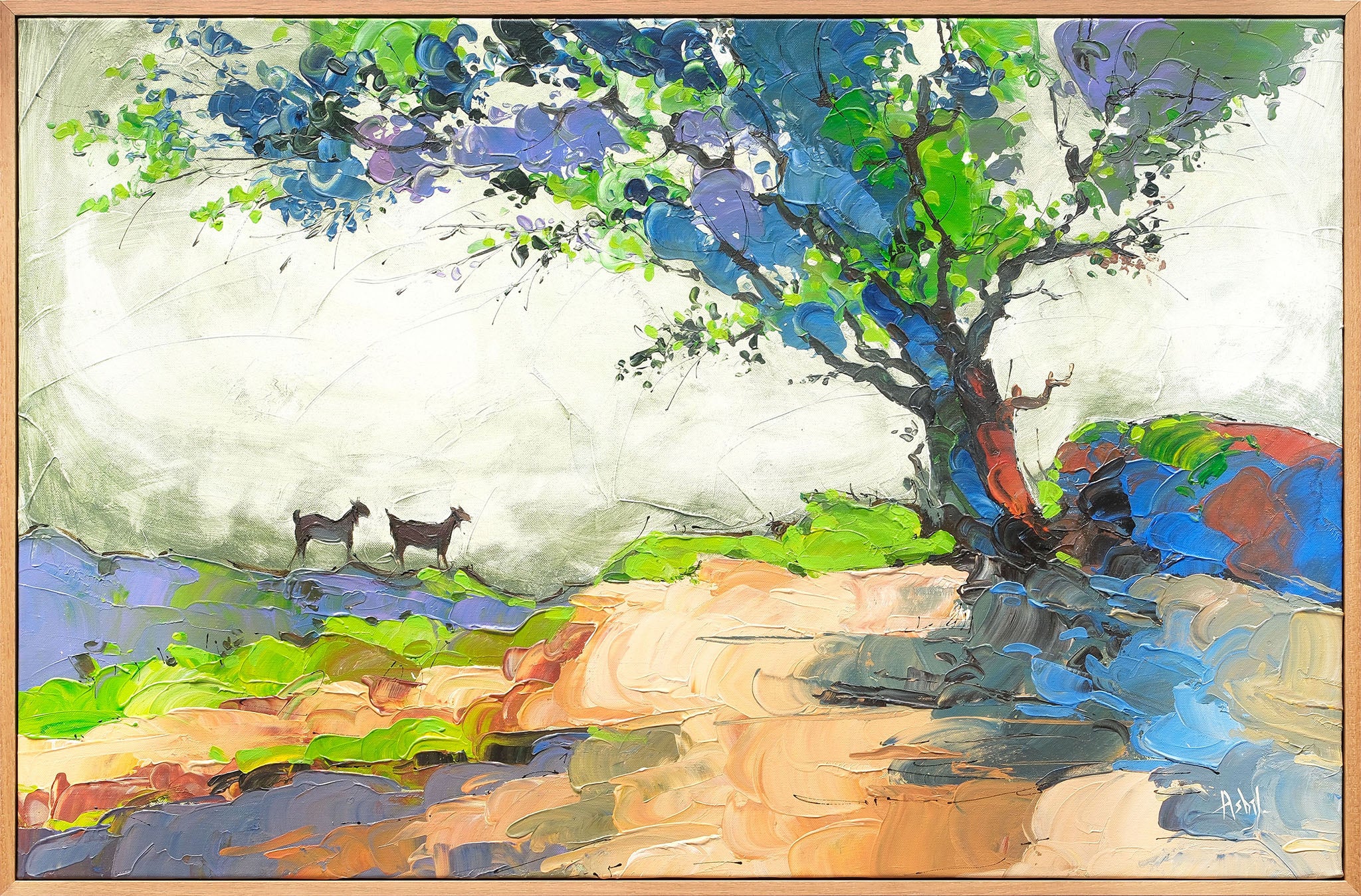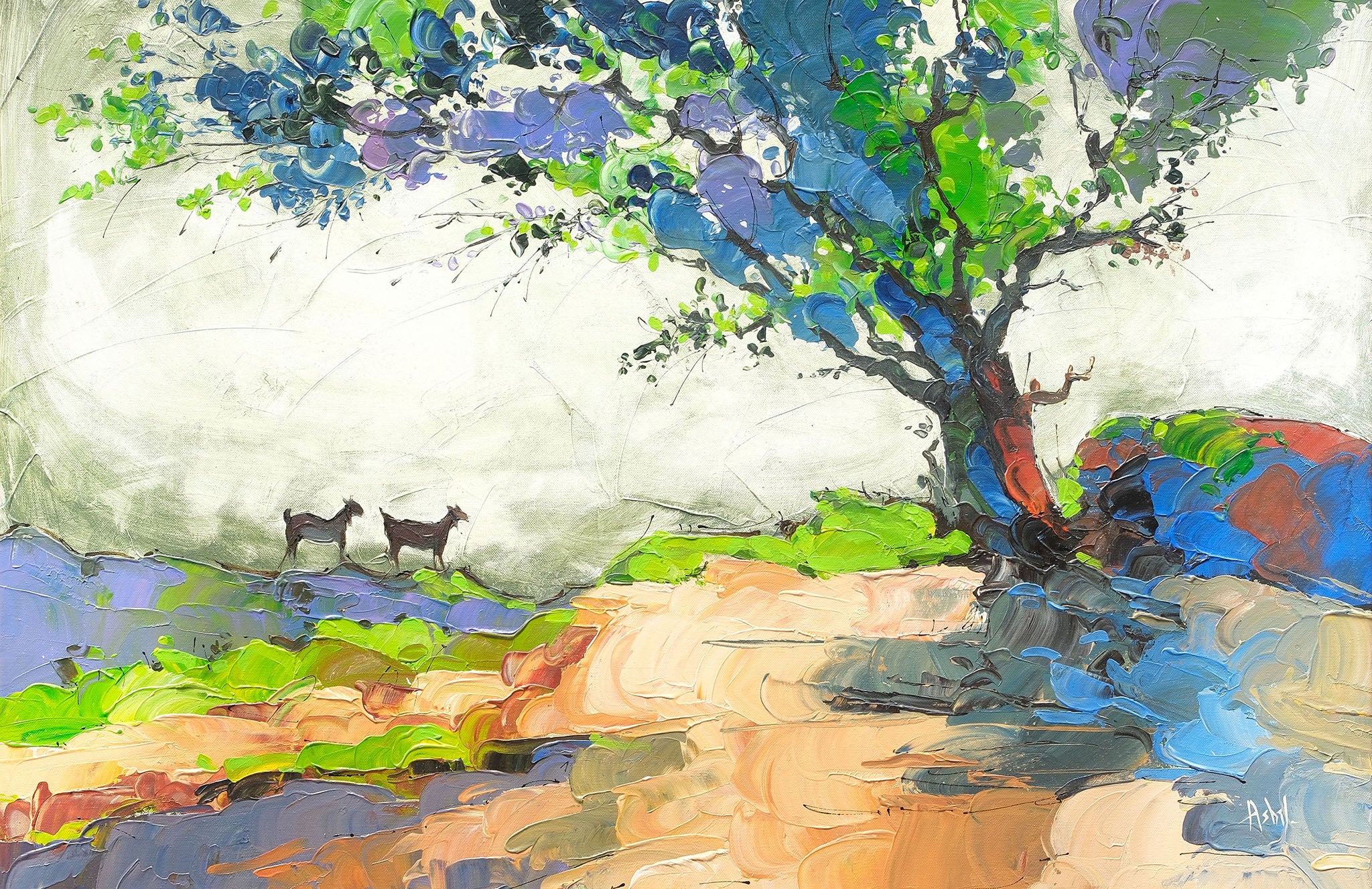Bold, textured brushstrokes create a vibrant, slightly abstracted outdoor scene. A colorful tree anchors the right, while two dark figures stand on green and lavender in the midground. A light path winds towards the tree against a hazy, light background. Energetic and expressive marks capture a sunny landscape.