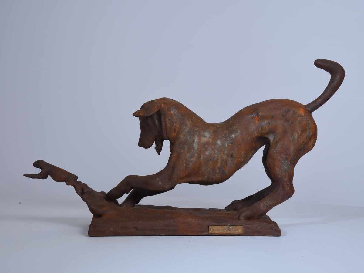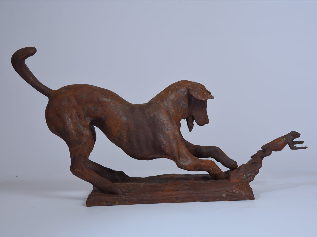 This captivating sculpture captures the thrill of the chase, a dog mid-leap, a frog in swift escape. A dynamic masterpiece that brings movement and charm to any space!