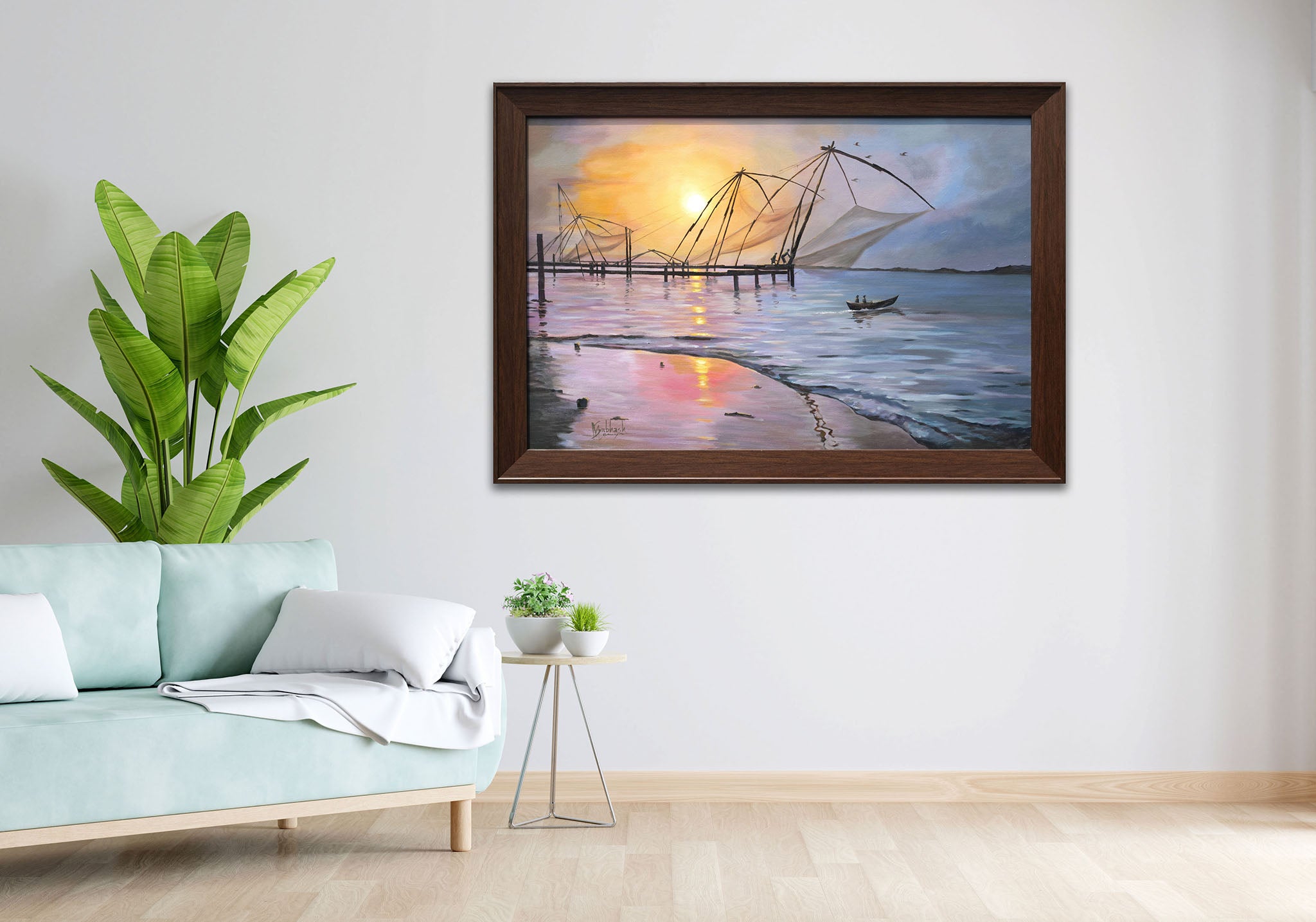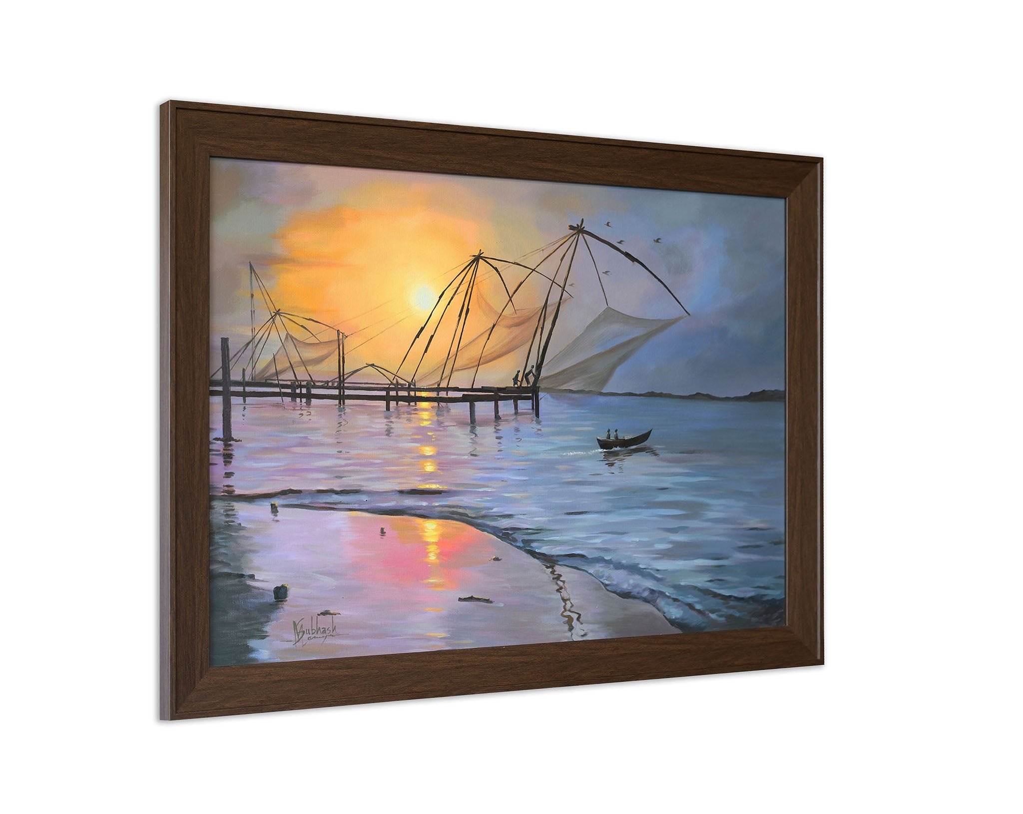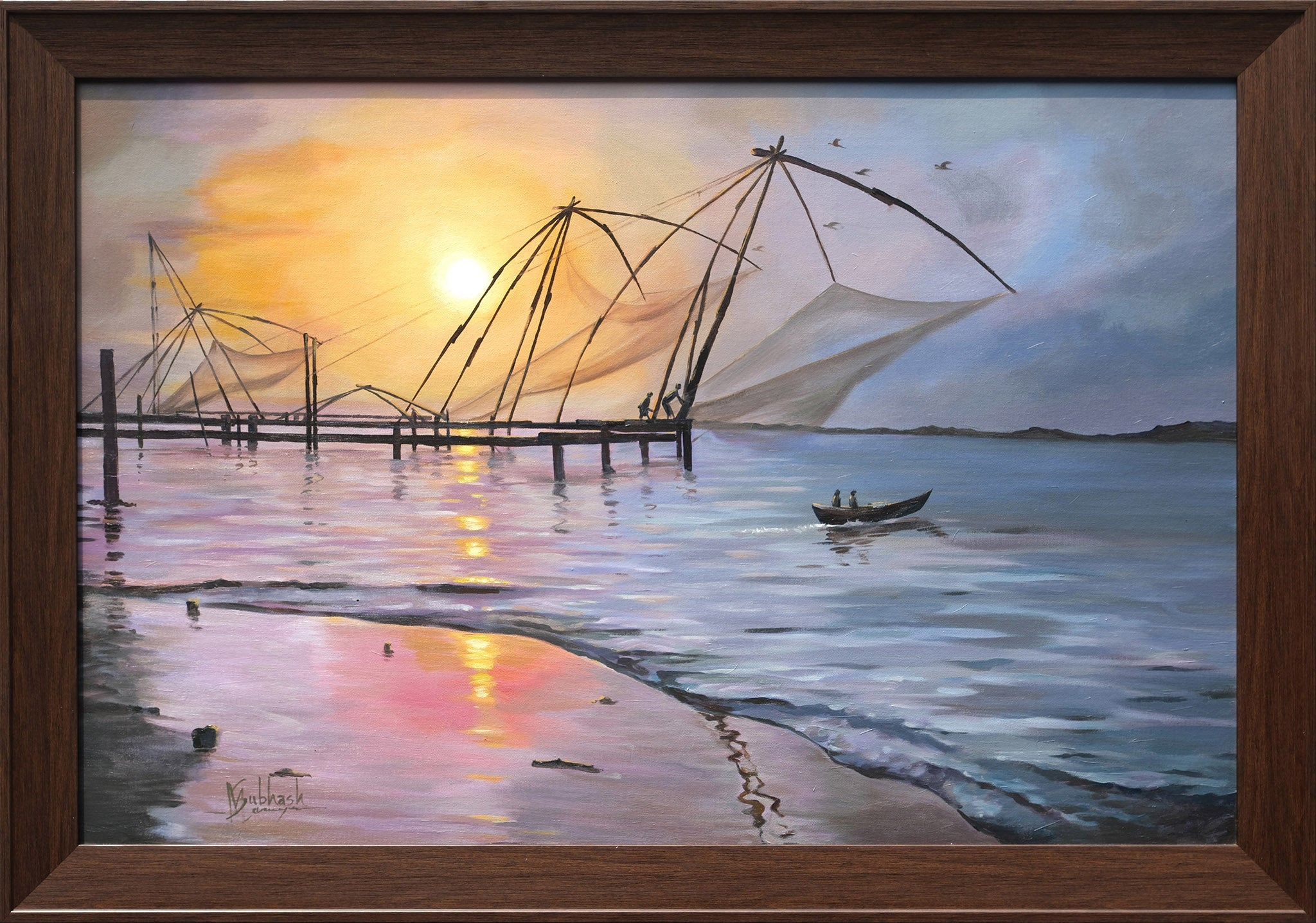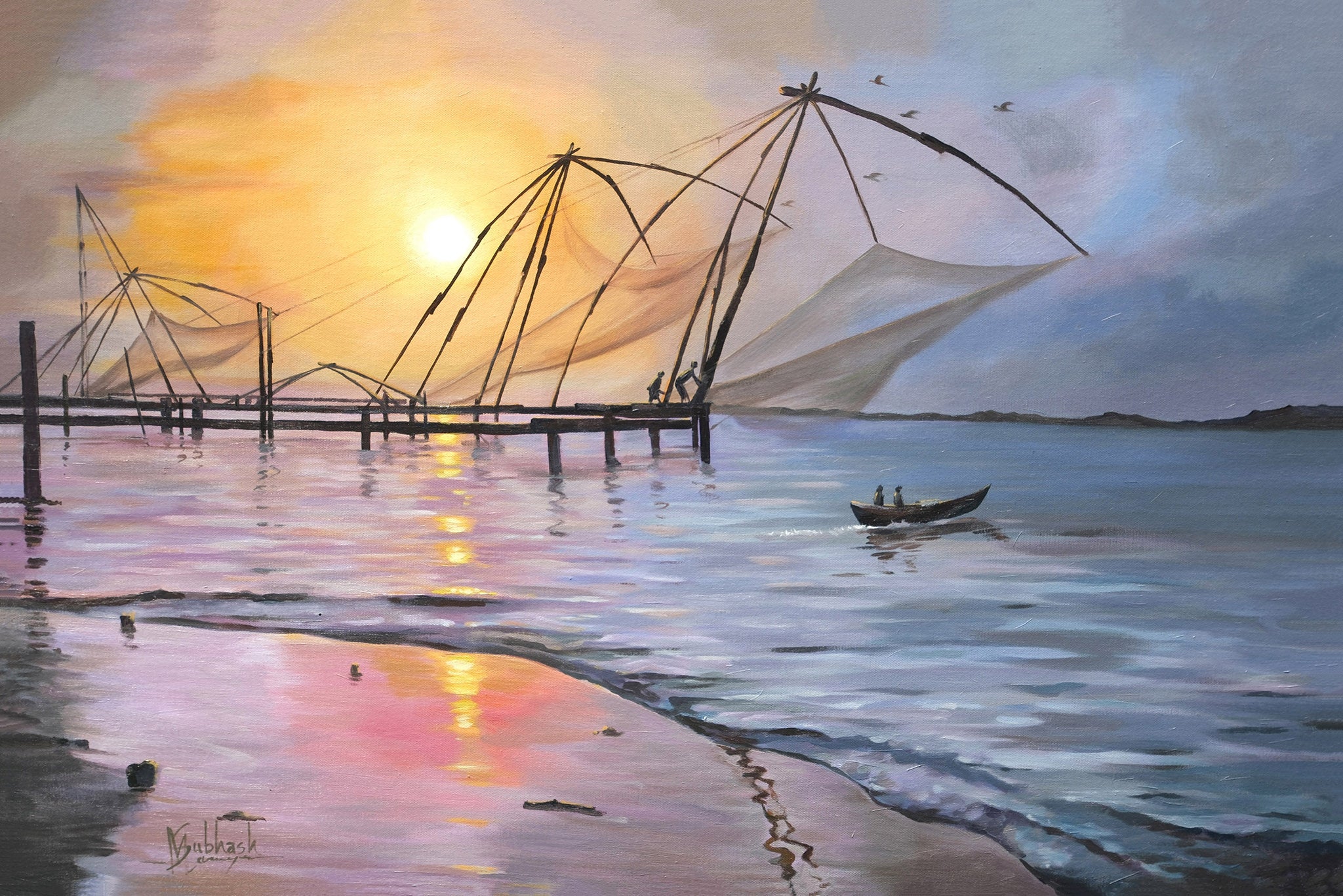 The painting captures the serene beauty of the Chinese fishing nets in what appears to be the backwaters of Kerala. Silhouetted against a vibrant sunset sky with hues of orange, yellow, and purple reflected in the calm water, the large, intricate nets stand as iconic structures. A small boat with figures glides across the water, adding a sense of scale to the vastness of the scene. The atmosphere is tranquil, evoking the quiet rhythm of coastal life at dusk.
