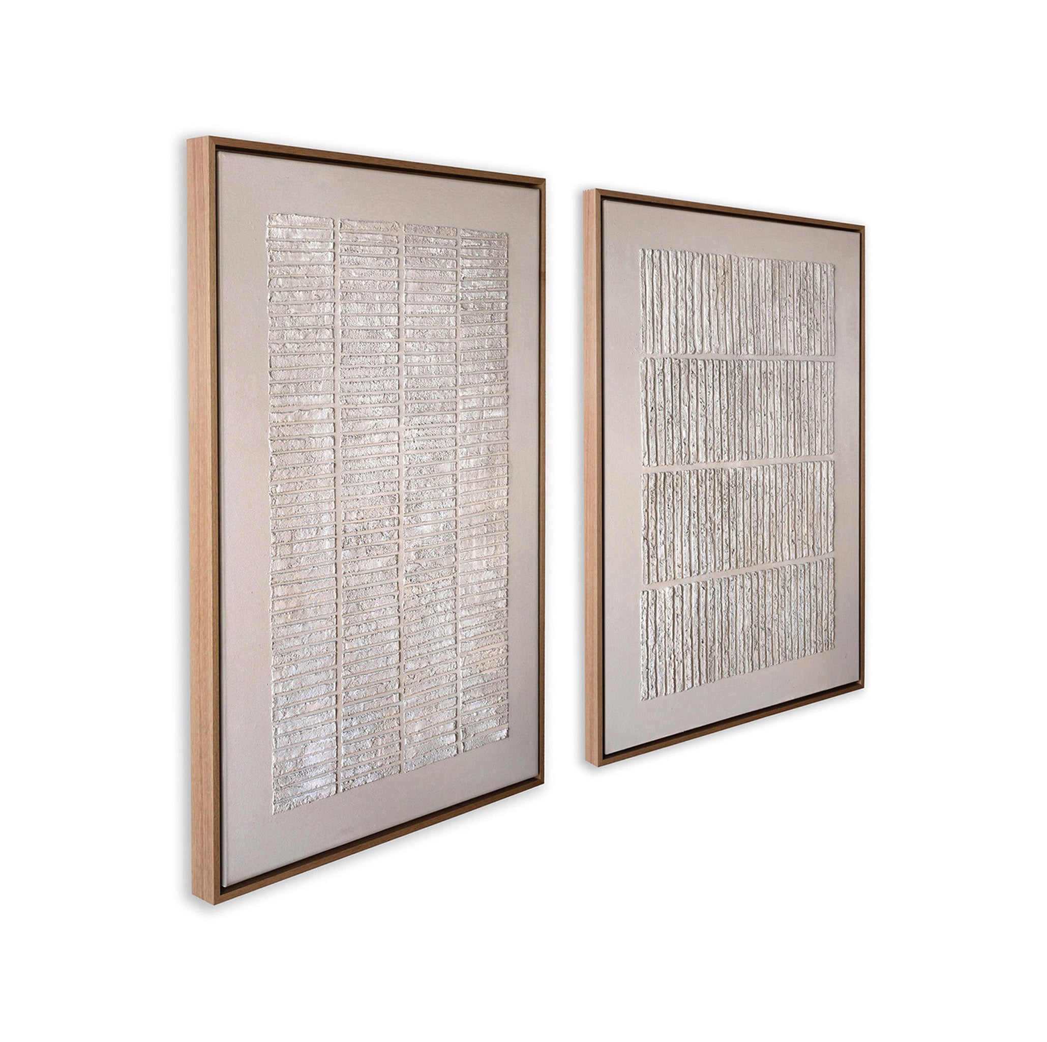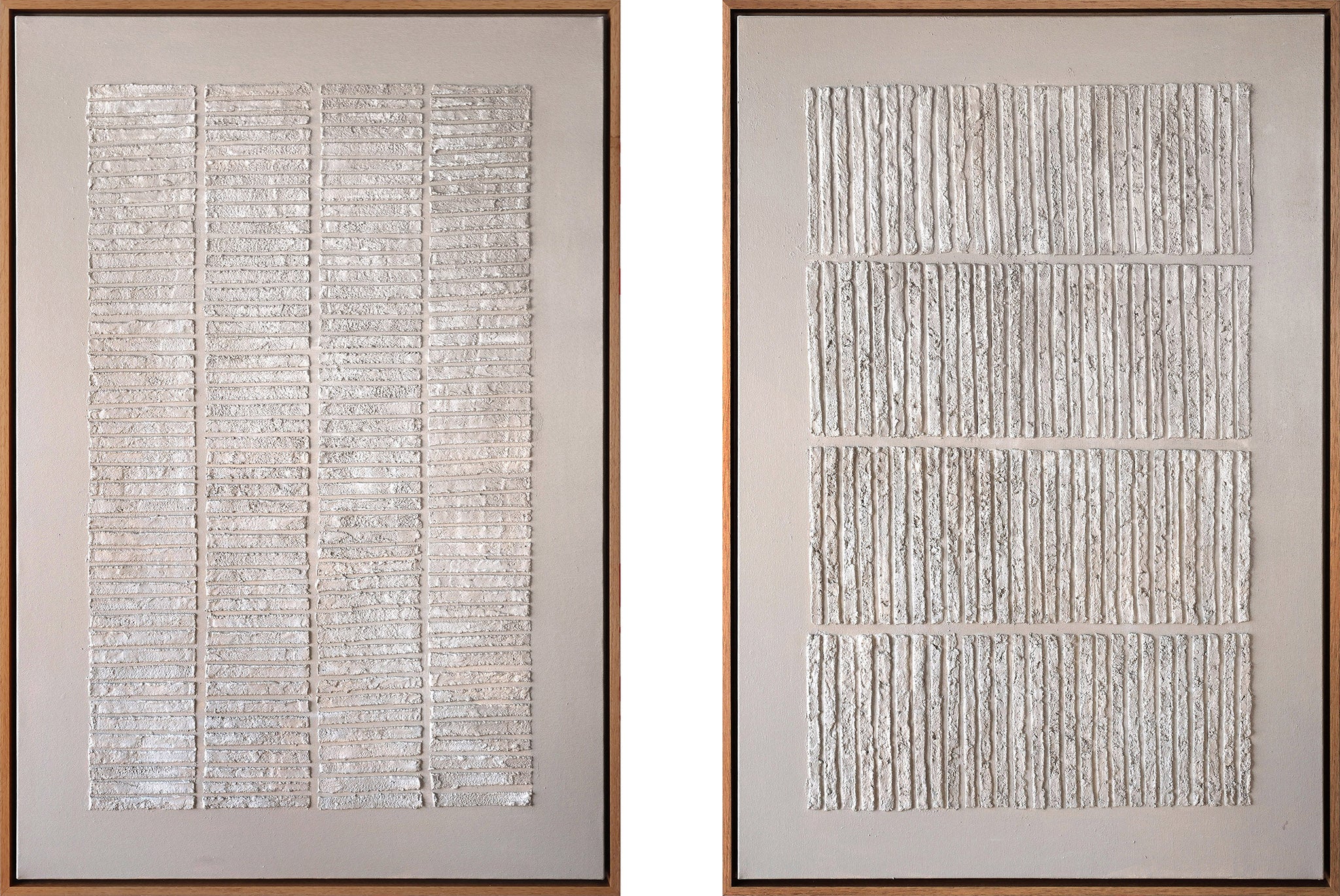 This contemporary mixed media diptych presents a textured, minimalistic composition. Vertical lines, meticulously gridded, create a rhythmic visual pattern across both pieces. A neutral grey palette enhances the tactile surface, with subtle tonal variations adding quiet complexity. Simply framed, the artwork emphasizes understated elegance and a contemporary aesthetic. The structured lines highlight the interplay of light and shadow, inviting calm reflection on their clean design and subtle details.