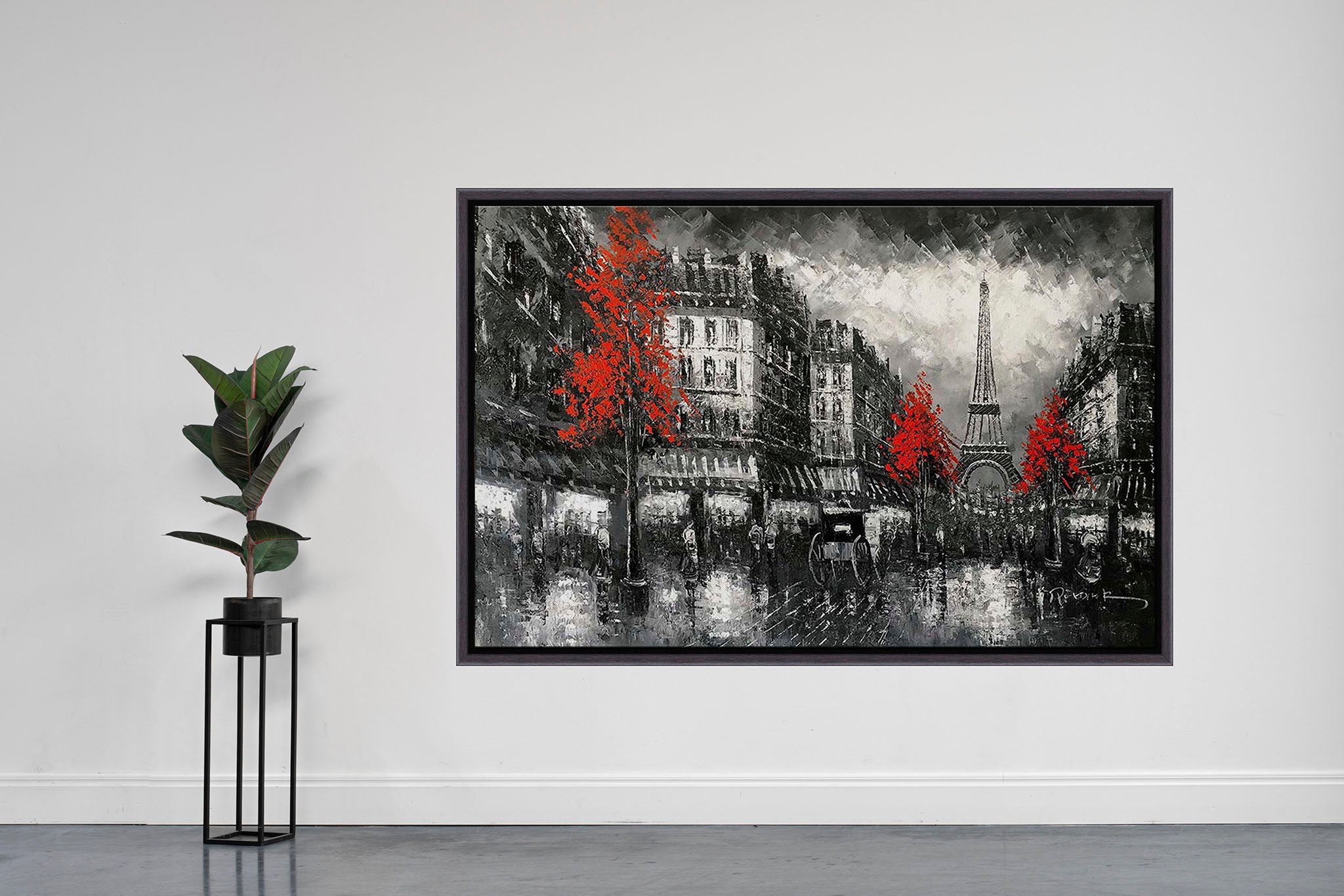 A breathtaking monochrome depiction of Paris, this artwork beautifully contrasts the timeless charm of the Eiffel Tower and bustling city streets with the bold crimson hues of autumn trees. The textured brushstrokes bring the rainy romance of Paris to life, making it a striking statement piece for art lovers and dreamers alike.