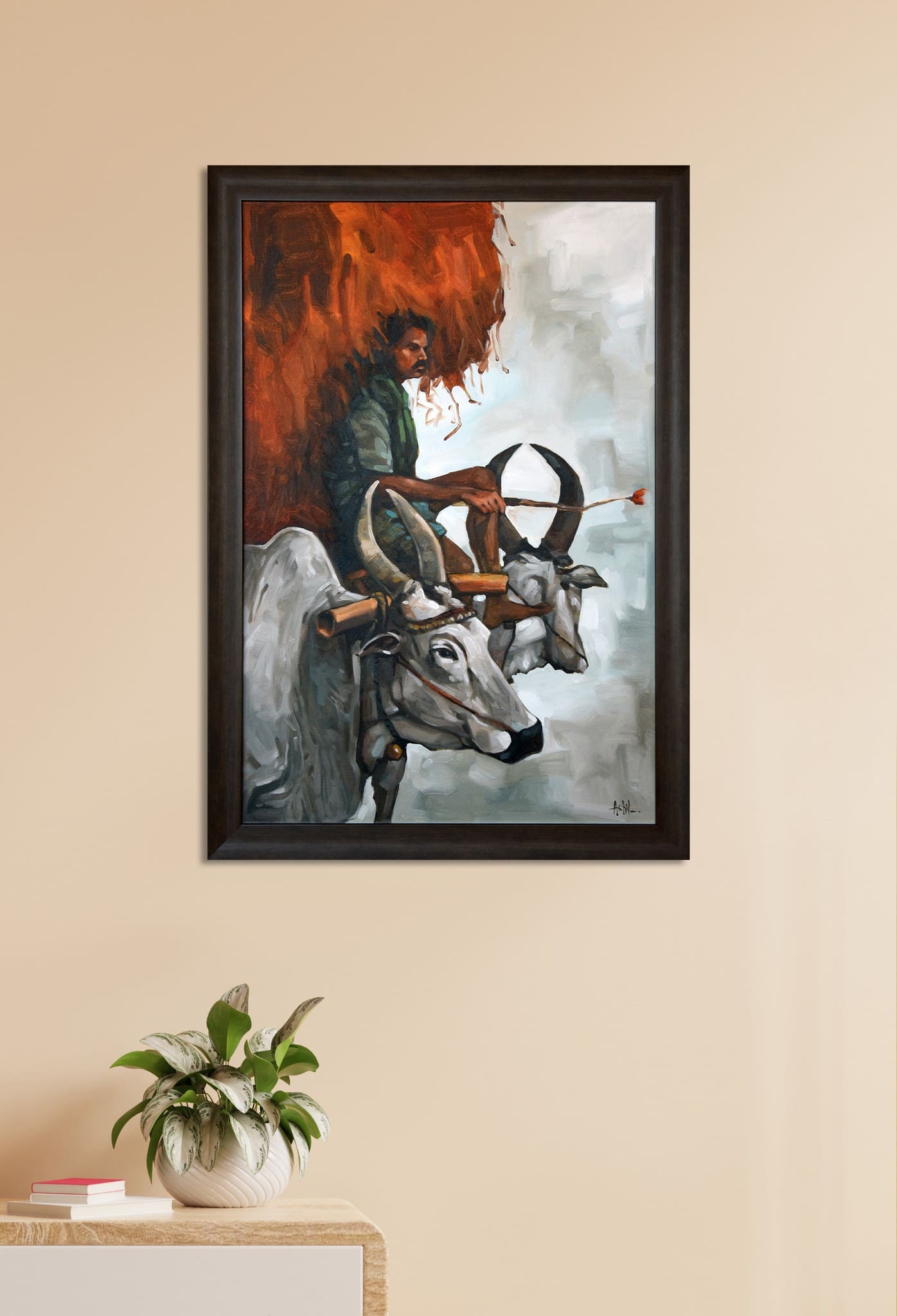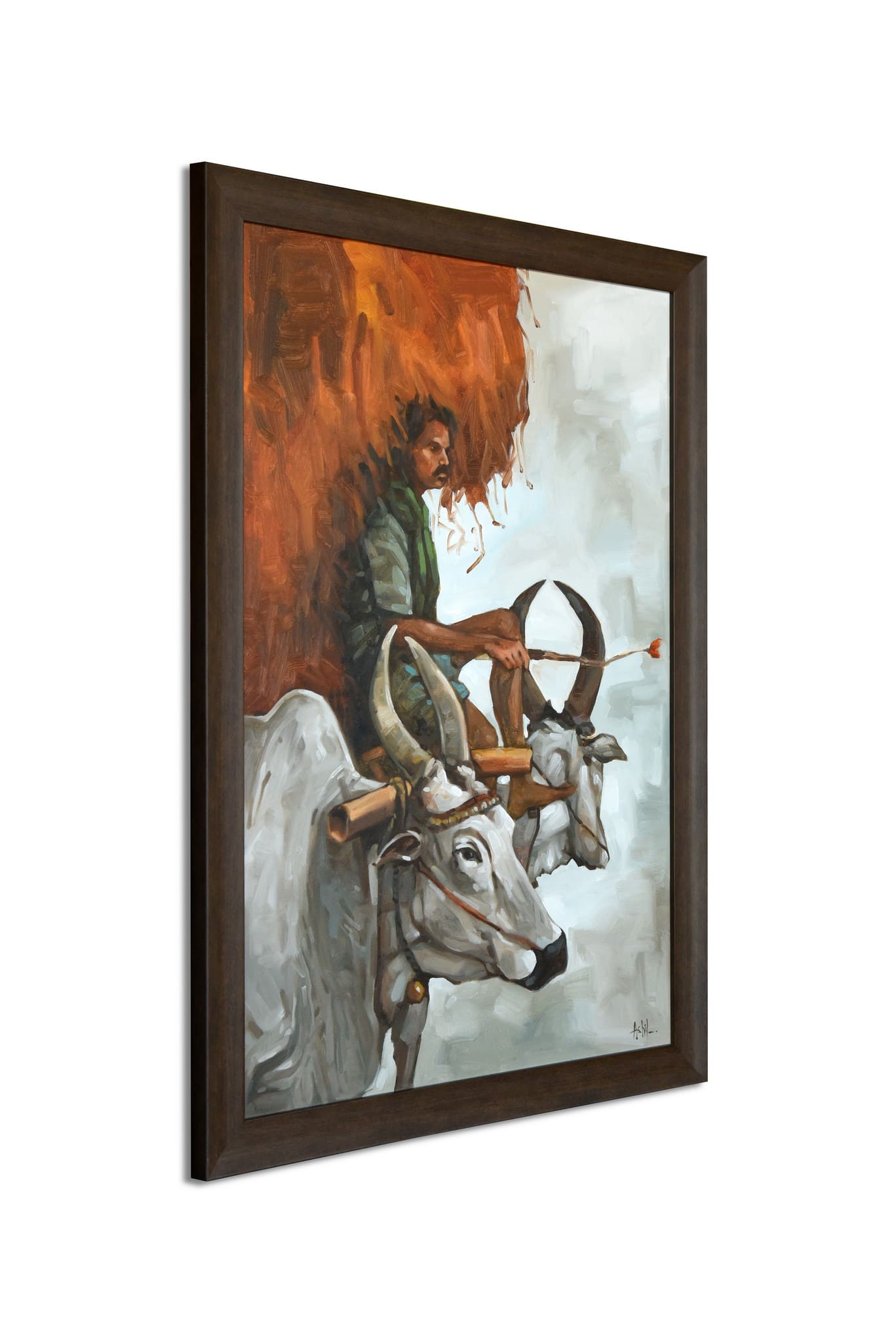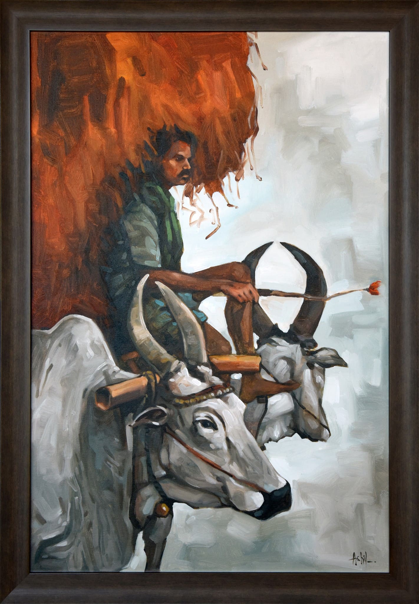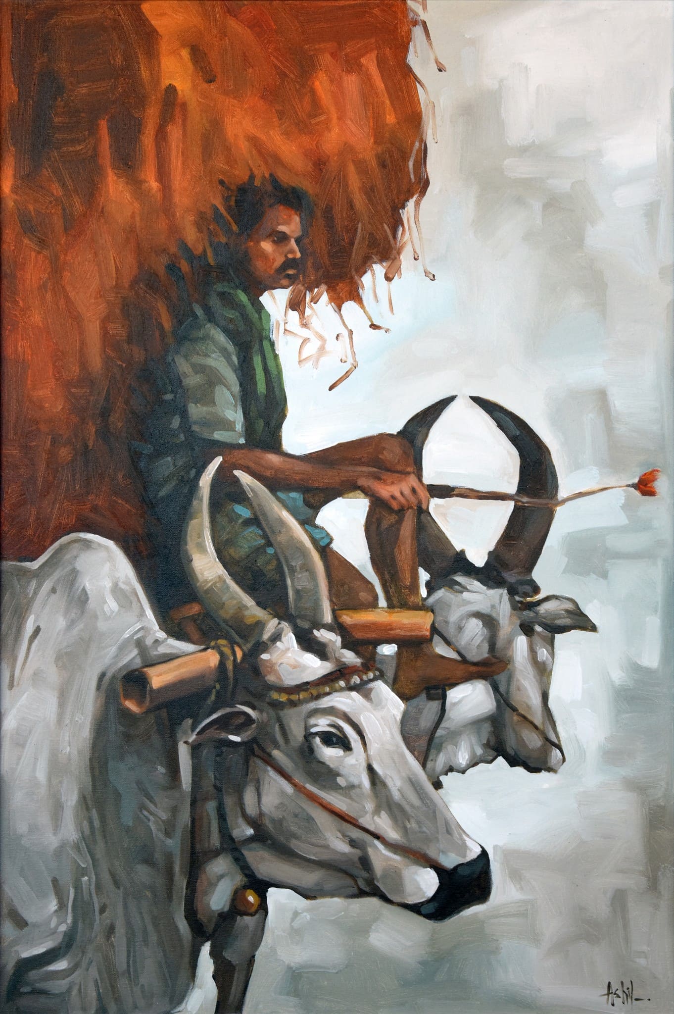 A captivating depiction of rural resilience, Hay Stack illustrates a farmer atop his bullock cart, carrying a towering load of hay. The earthy tones and dynamic brushstrokes evoke the spirit of traditional agrarian life, making it a stunning tribute to hard work and perseverance