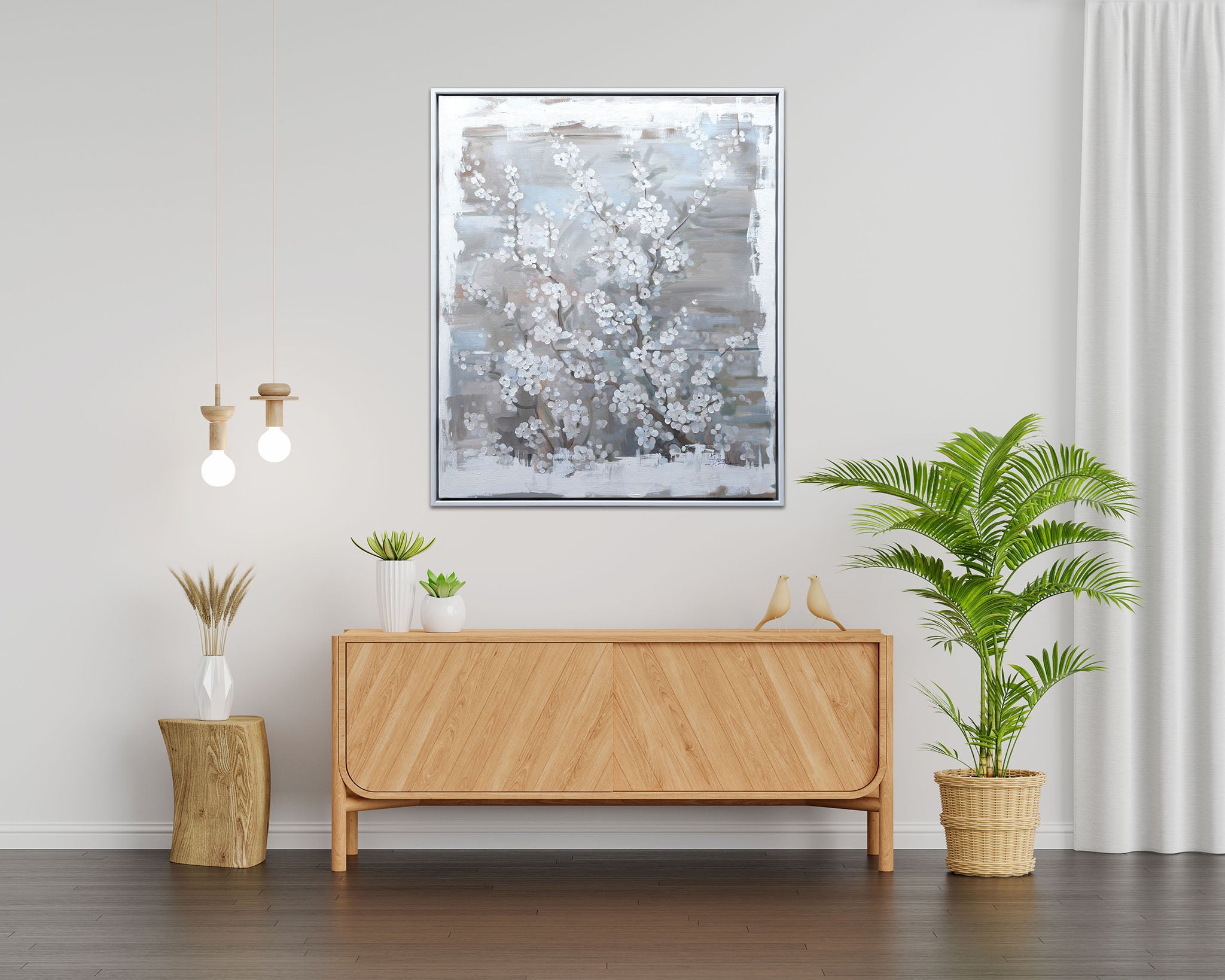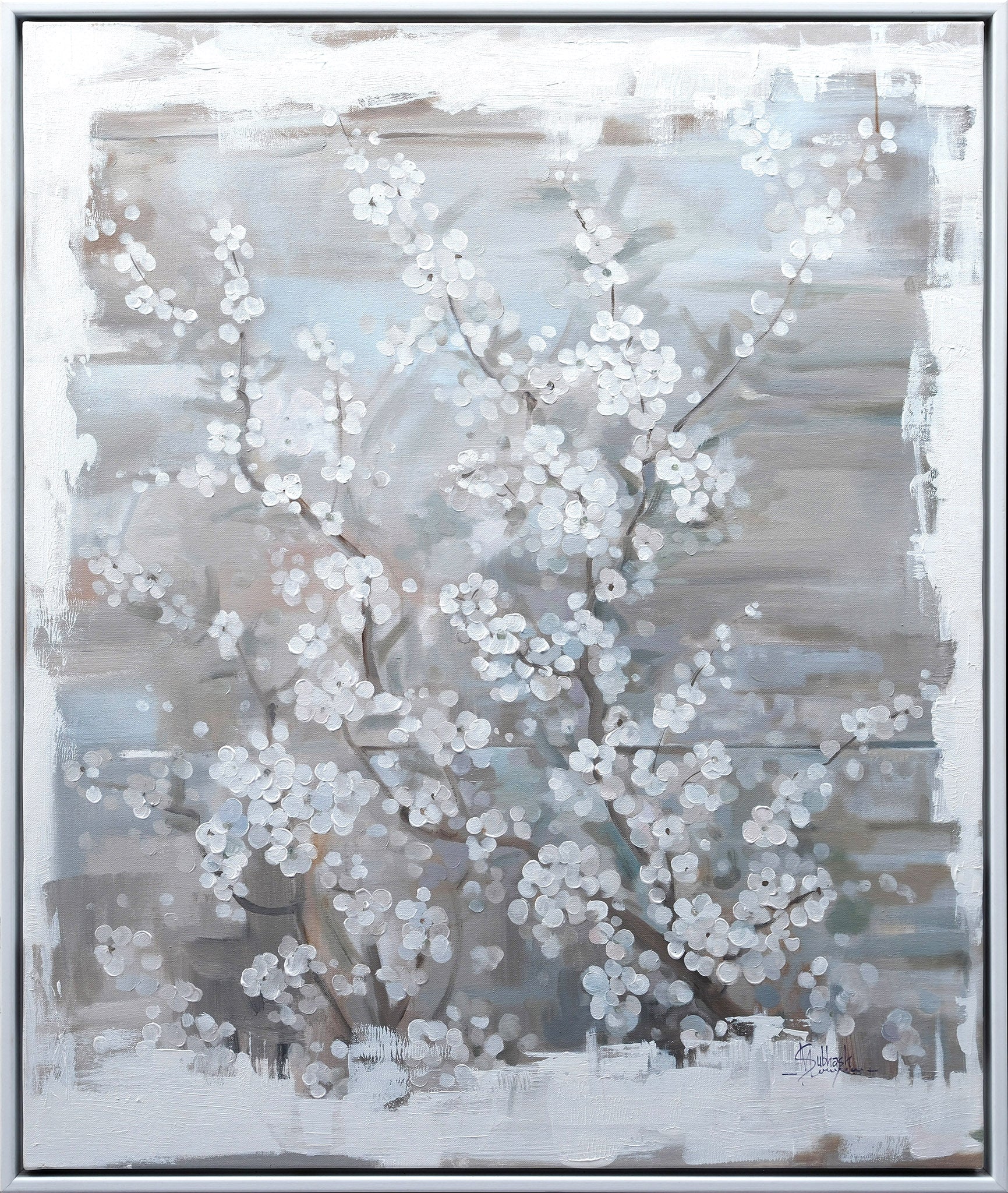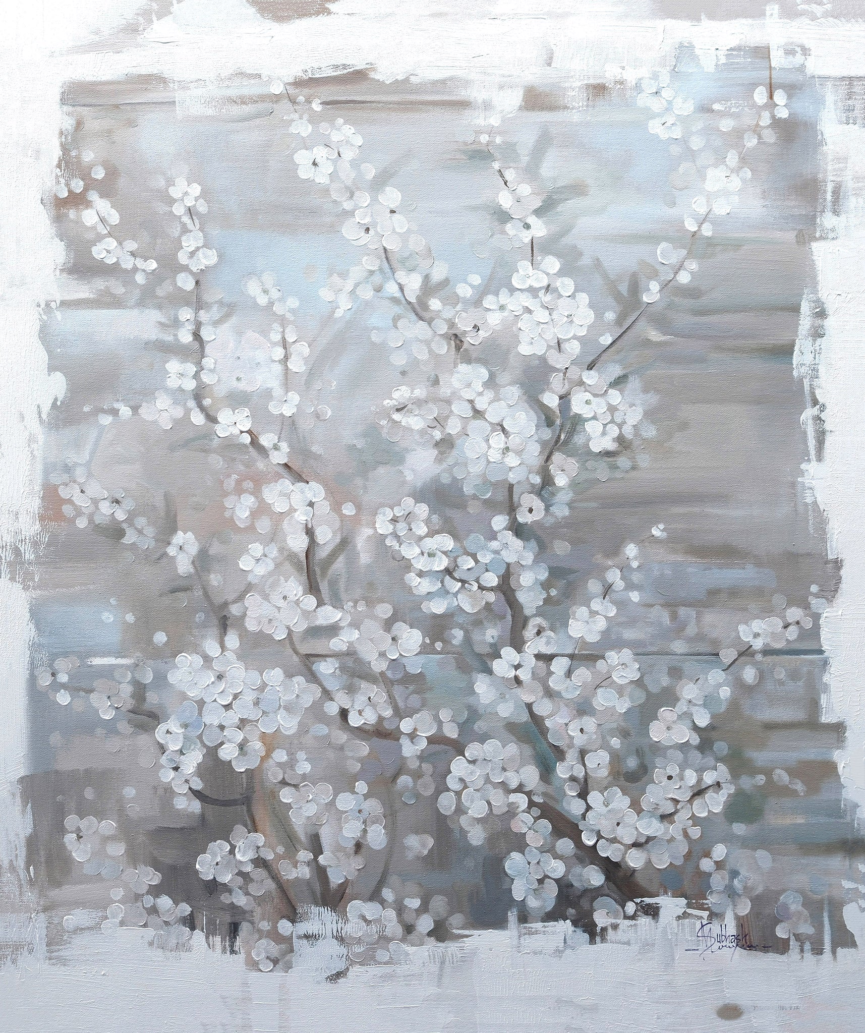 This contemporary artwork depicts a blossoming tree, likely a cherry or similar flowering tree, rendered with a painterly and slightly textured style. Delicate white blossoms, densely clustered along thin, dark branches, dominate the foreground and center of the composition. The background features soft, blended washes of muted grays, whites, and hints of pale blue and brown, suggesting a hazy or slightly abstract atmosphere. The brushstrokes are visible, adding to the artwork's tactile quality and impressionistic feel. The overall mood is serene and elegant, capturing the ephemeral beauty of springtime blossoms.